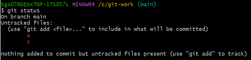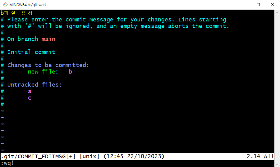 git status // 장바구니에 담긴 b파일이 로컬 리포지터리에 저장된 모습을 볼 수 있다.