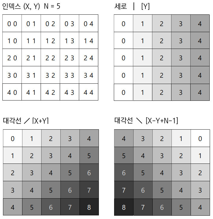 처음 작성한 코드는 2차원 배열을 만들어, 위와 똑같은 구조로 검사하는 방식이었다.(당연히 시간 초과) 시간을 줄이는 순차적 방법은 다음과 같다.