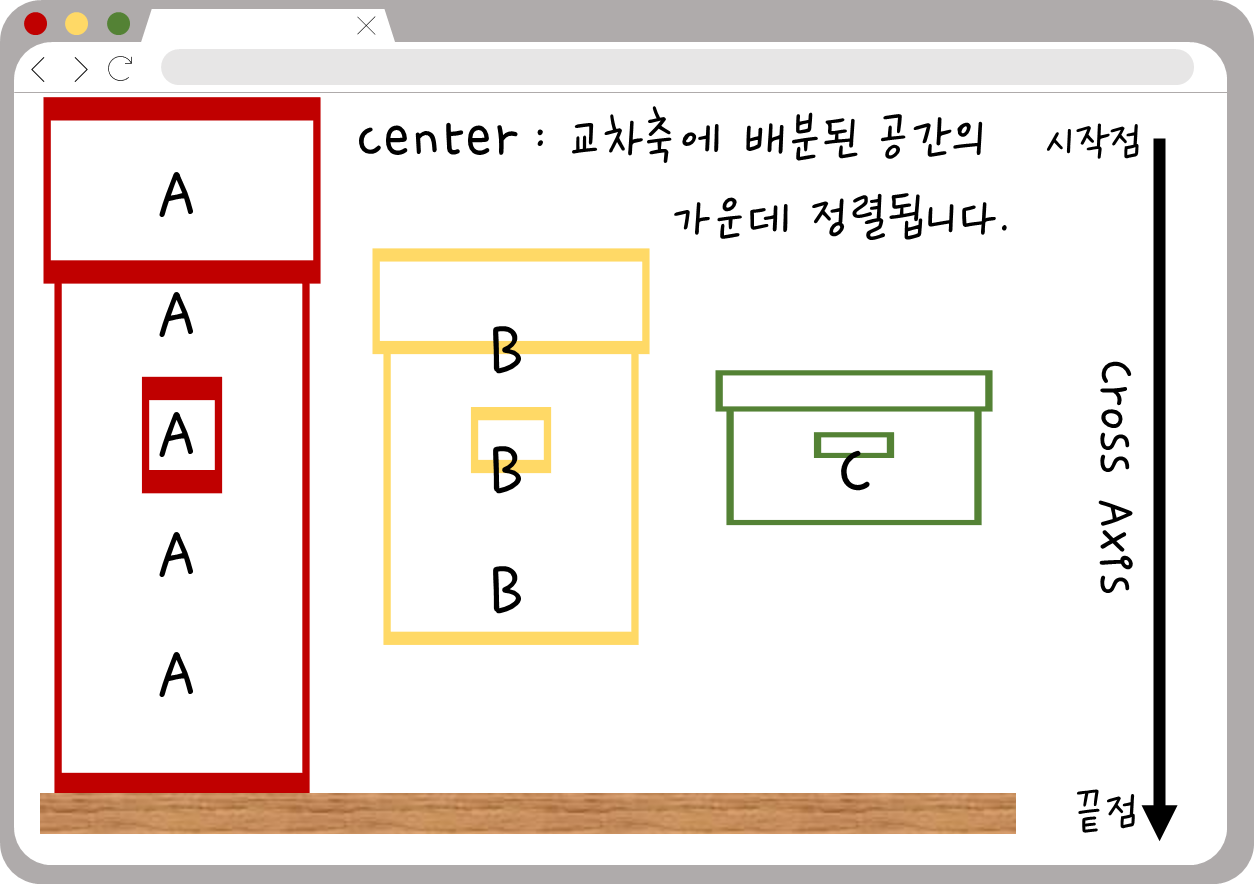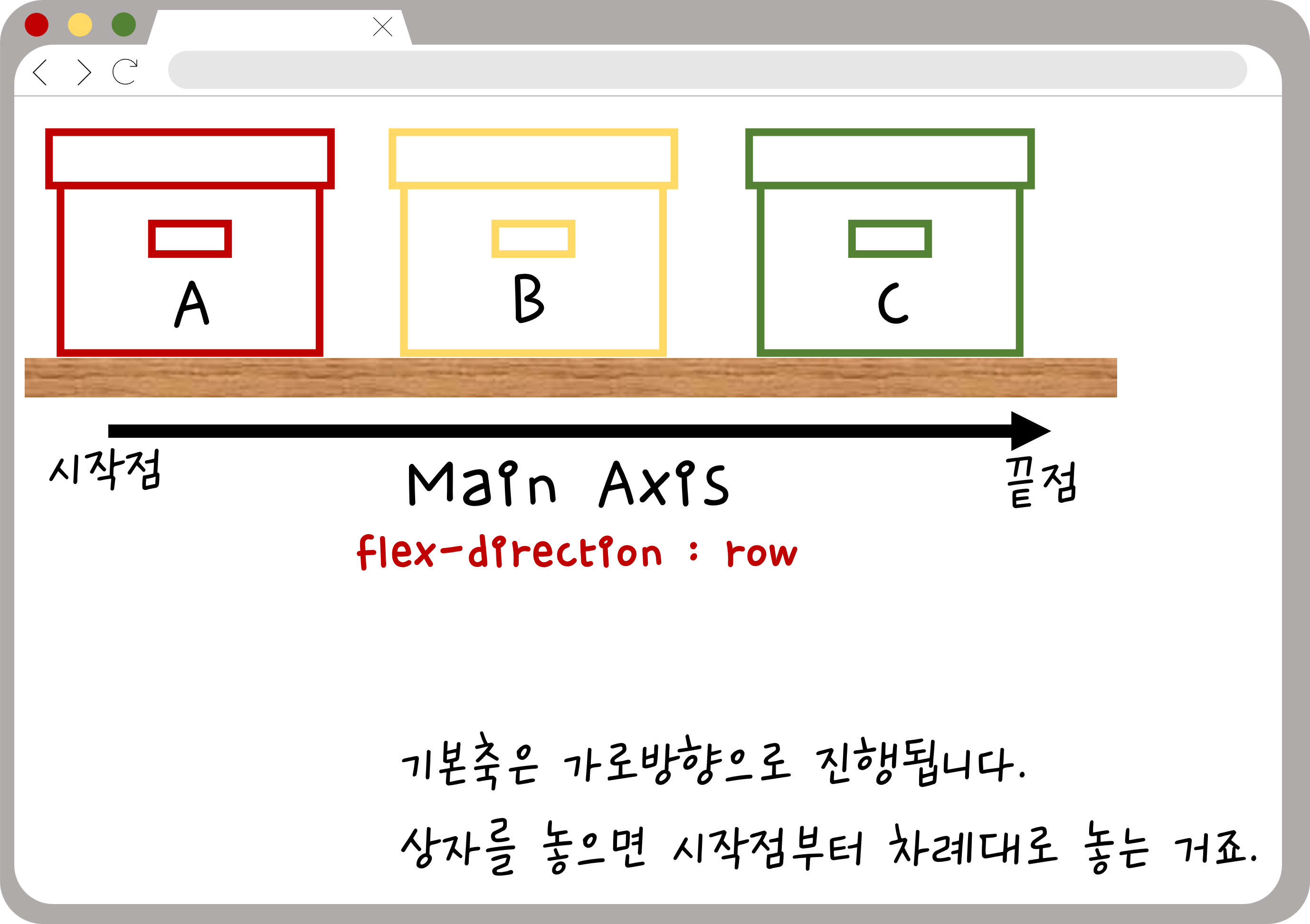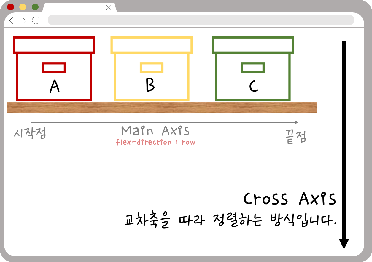 display: flex;μ μ€μ νλ©΄ κ° νλͺ© λ³ λ΄λΆ μμμ ν¬κΈ°λ‘ μ£ΌμΆμ λ°λΌ μ λ ¬λ©λλ€. λμ΄κ°μ΄ κ°μ₯ ν° νλͺ©μ λ§μΆμ΄ λλ¨Έμ§ λͺ¨λ νλͺ©λ€μ΄ λμ΄λ©λλ€.flexboxμλ μ£ΌμΆ(Main Axis)μ κ΅μ°¨μΆ(Cross Axis)κ° μμ΅λλ€. flexboxλ μ΄ λ μΆμ μ€μ νκ³ μμ§μ΄λ κ²μ΄λ―λ‘ μΆλΆν° μ΄ν΄νλ κ²μ΄ μ’μ΅λλ€.