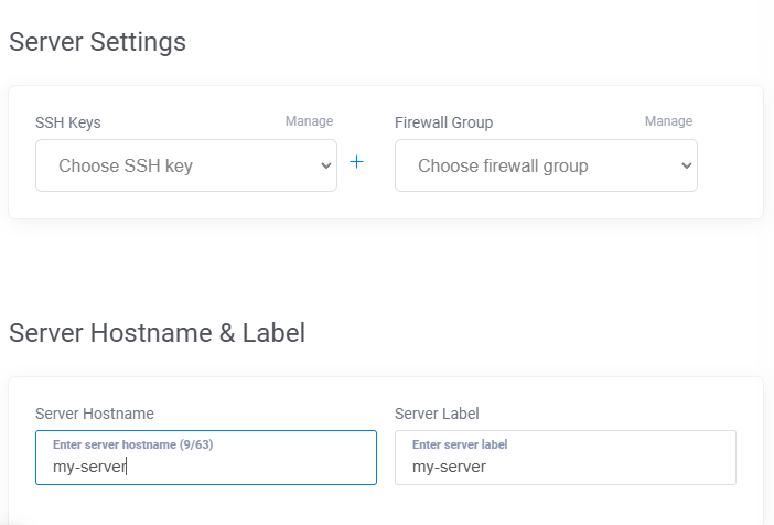SSH Key를 미리 추가하거나 방화벽 정책을 미리 추가할 수 있다. 방화벽은 OS 내의 방화벽과 별개로 동작한다. OS에서 관리하고자 할 경우 설정하지 않아도 되고, OS 방화벽과 함께 이중으로 사용해도 된다. 아래에는 호스트명과 웹 관리자에서 사용할 서버의 별칭을 적어주면 된다.