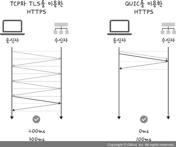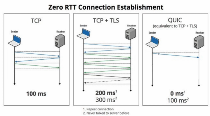 QUIC은 TCP를 사용하지 않기 때문에통신을 시작할 때 번거로는 3-웨이 핸드셰이크를 할 필요가 없다.