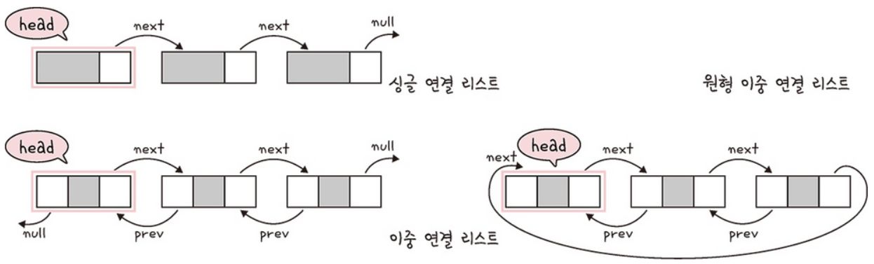 싱글 연결 리스트, 이중 연결 리스트, 원형 이중 연결 리스트