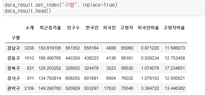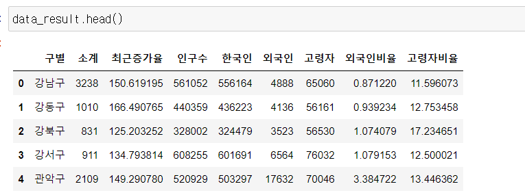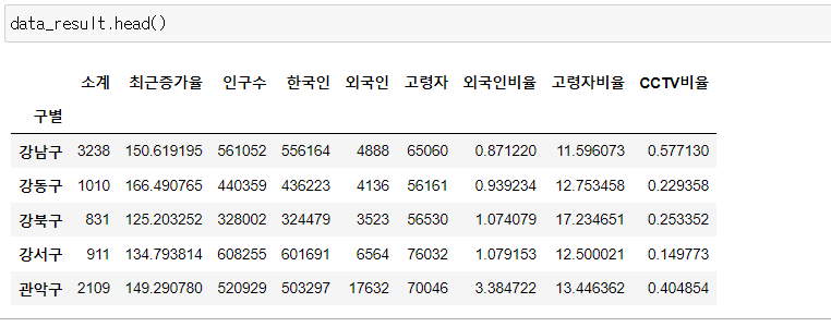 # CCTV와 인구수 모두 공통된 구를 갖고 있어서 빠지는 값 없이 출력됨