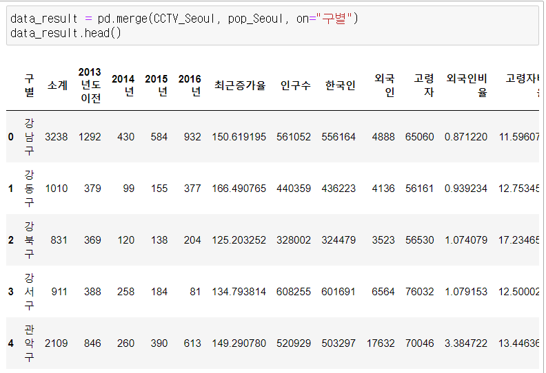 data_result = pd.merge(CCTV_Seoul, pop_Seoul, on="구별")