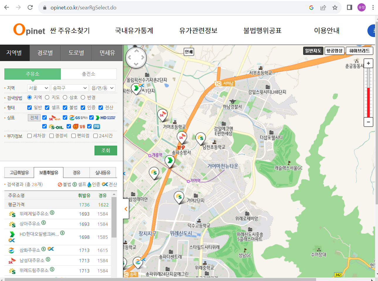 우리는 위 사진처럼 싼 주유소찾기에서 지역별을 선택해서 나오는 페이지에서 크롤링을 진행한다. 페이지에서 주유소 지역을 변경하더라도 url값은 변화가 없다. 따라서 BeautifulSoup만으로 크롤링하기는 어렵고, Selenium을 이용하여 웹 페이지에 접근할 것이다.