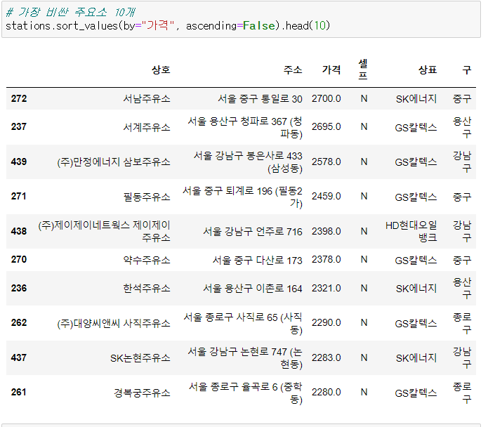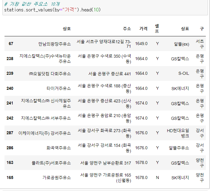 또, 가장 비싼 주유소 top10은 모두 일반 주유소였고 가장 값싼 주유소 top10 중에서 9등까지가 셀프 주유소였다는 점을 봤을 때, 셀프 주유소가 더 저렴하다는 분석이 타당하다고 생각한다.