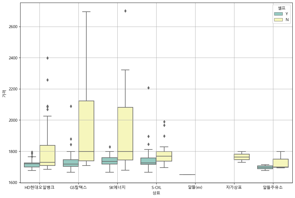 sns.boxplot(x="상표", y="가격", hue="셀프", data=stations, palette="Set3")