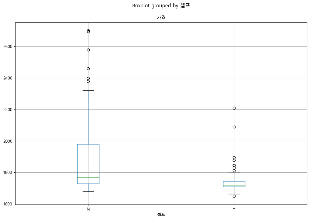stations.boxplot(column="가격", by="셀프", figsize=(12,8))