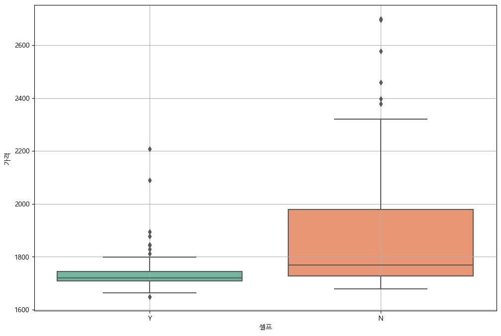 sns.boxplot(x="셀프", y="가격", data=stations, palette="Set2")