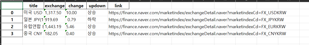 # updown = exchangeList[0].select_one(".head_info.point_up > .blind").text 이 코드는 환율 변동이 하락인 나라에서는 쓸 수 없기 때문에 에러가 발생해서 사용하지 않았음