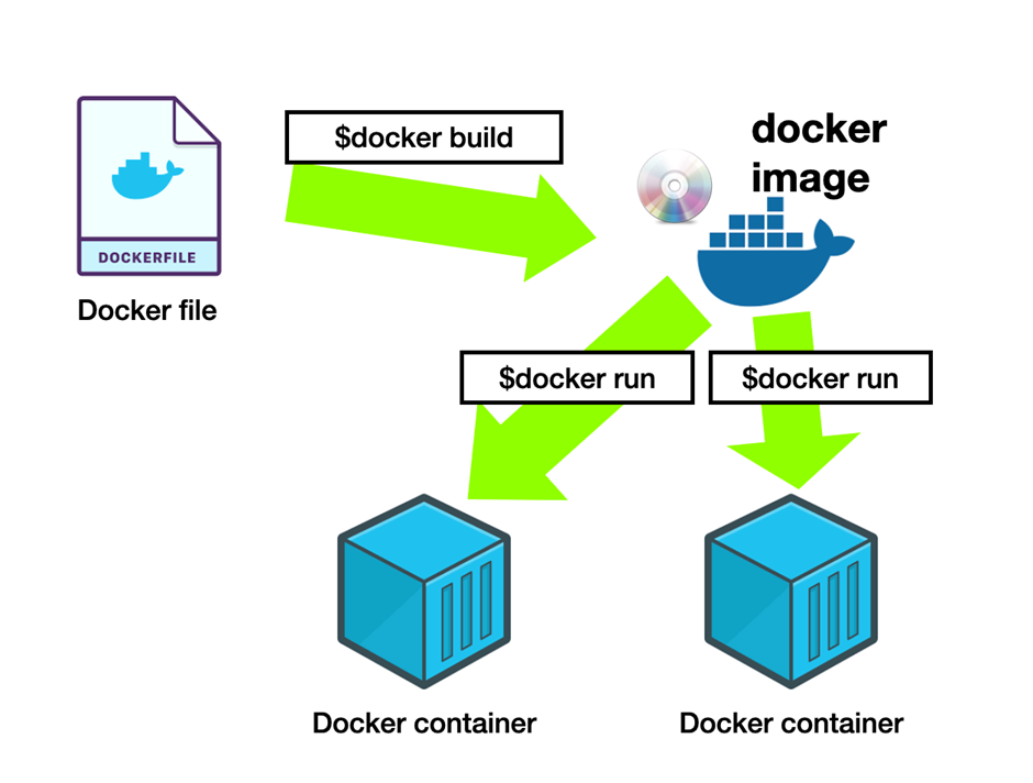 요약하자면, Dockerfile에서 Docker이미지를 만들고, 그 이미지를 사용하여 여러 개의 Docker 컨테이너를 실행할 수 있음을 나타낸다.