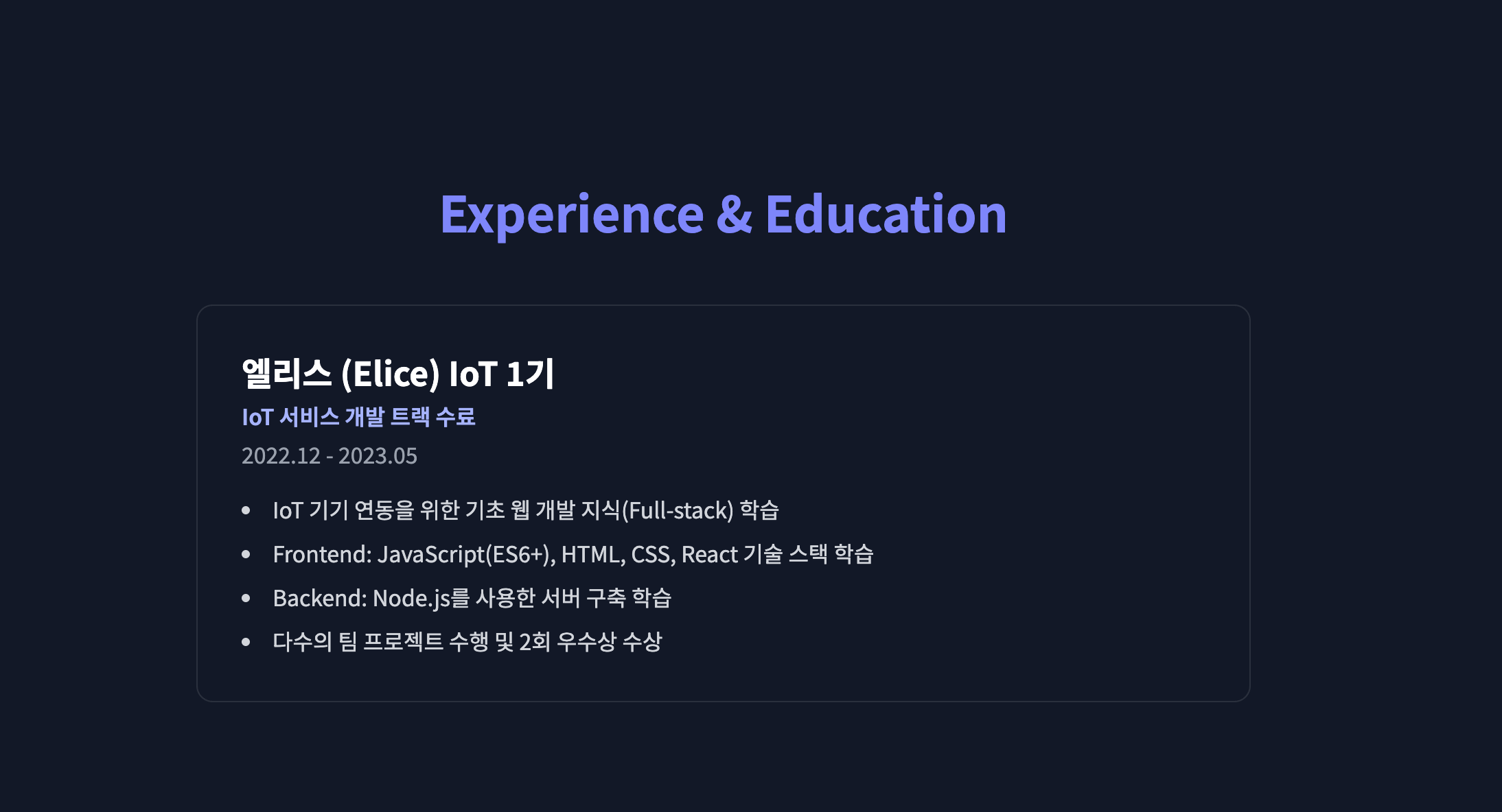 ⭐ 앞부분(Home, About, Projects)에서는 '한 번에 한 화면씩' 크게 스크롤하며 몰입하게 하고, 뒷부분(Experience, Certifications 등)에서는 py-24(96px 여백)만으로 섹션을 구분하여, 사용자가 더 빠르게 훑어볼 수 있도록 구현했다.