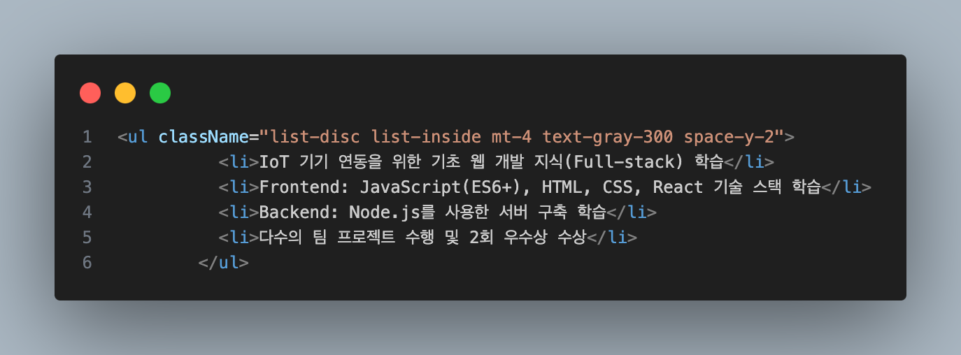 text-gray-300: 이 <ul> 안에 있는 모든 <li> 텍스트의 기본 색상을 밝은 회색으로 설정한다.