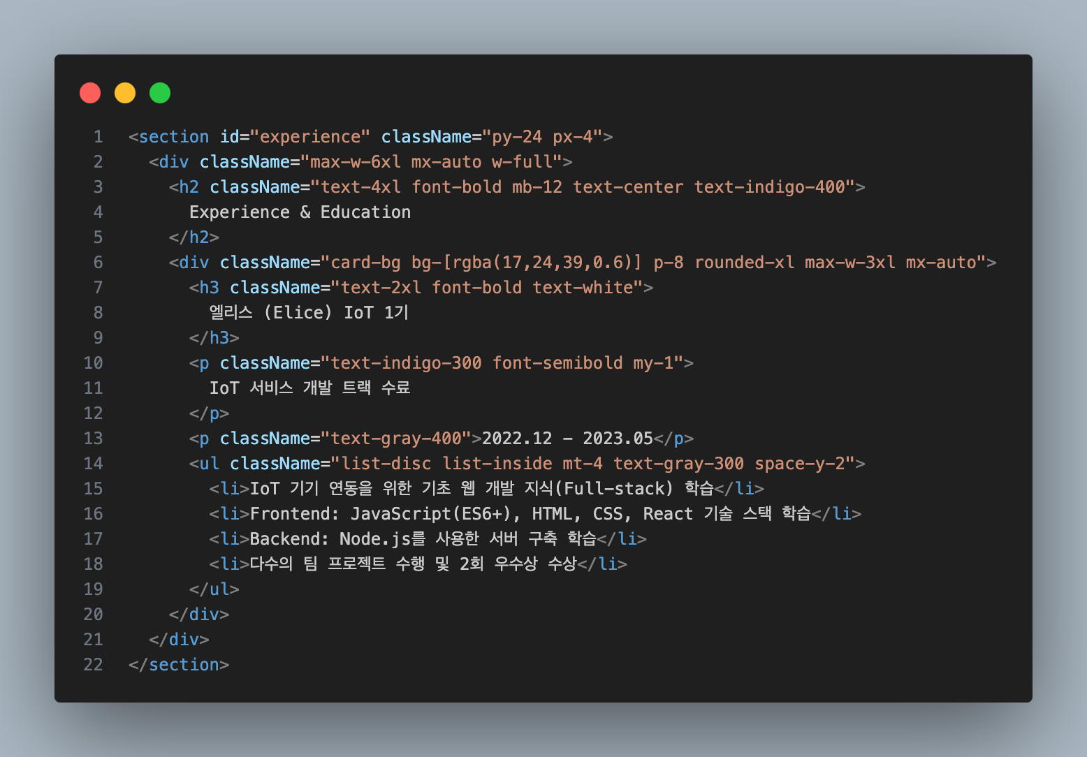 id="experience": <section> 태그에 experience라는 고유한 이름표(ID)를 붙인다. (내비게이션 위해서)