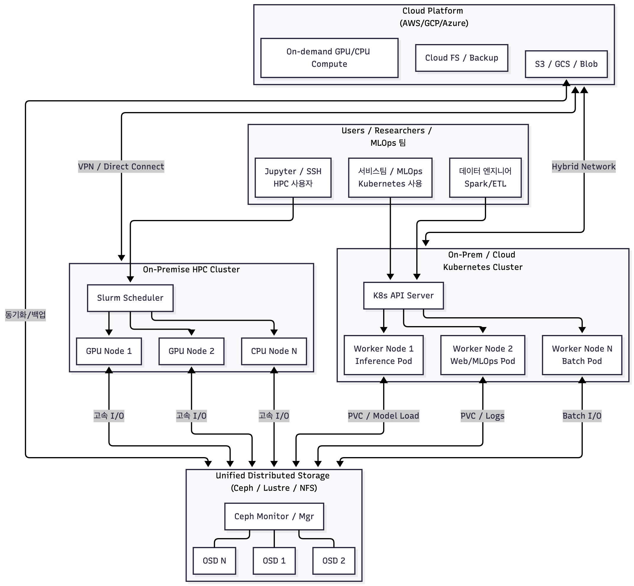 HPC + Cloud + K8s + Storage를 결합한 복합 구조입니다.