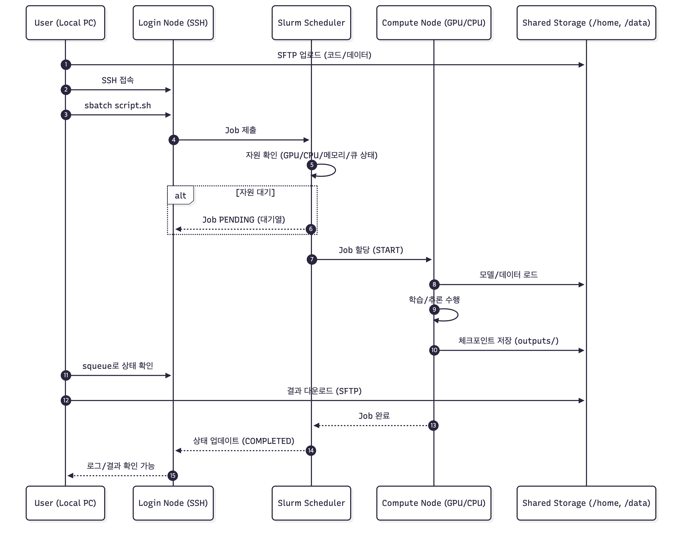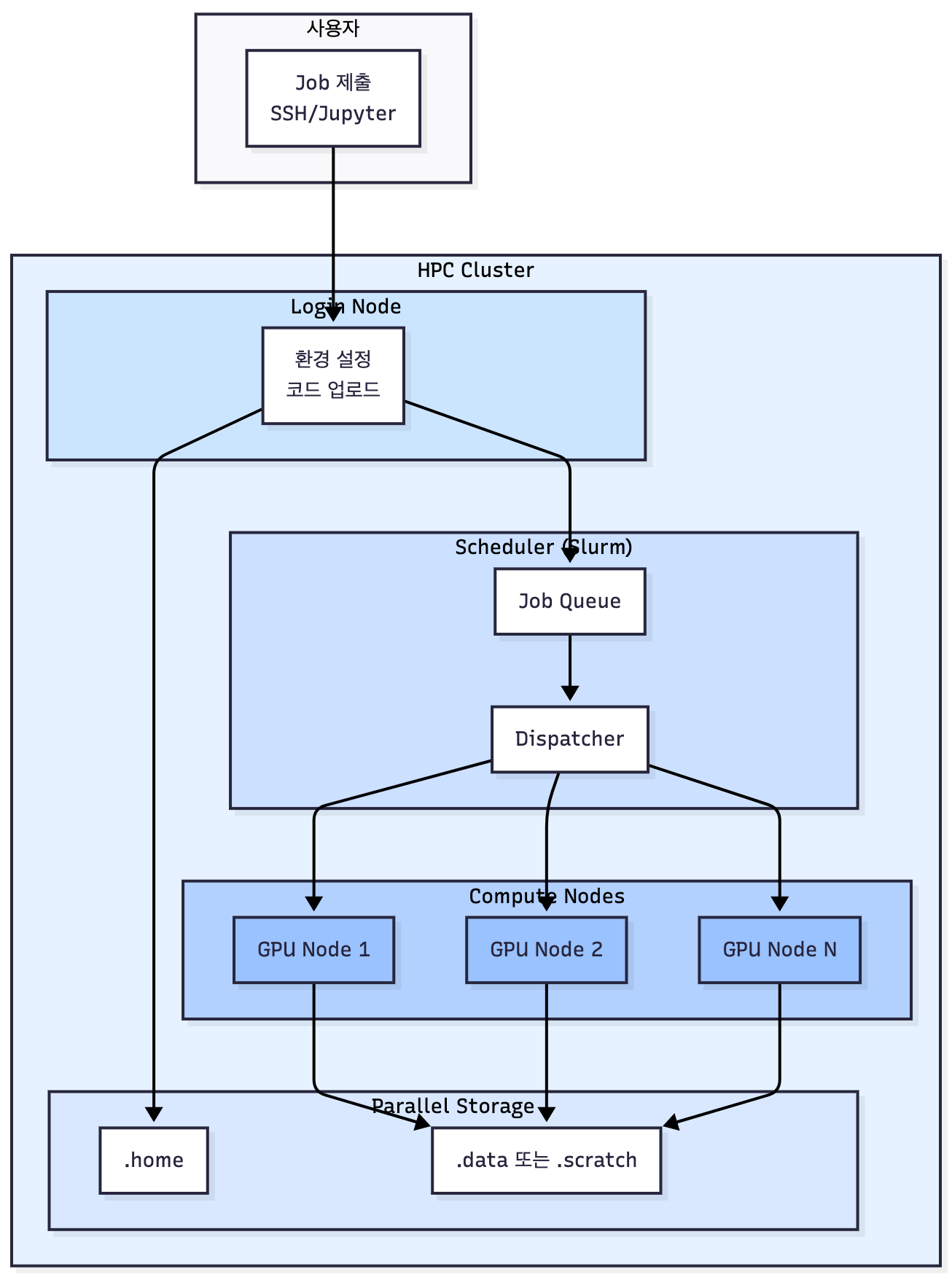 - 예: Slurm 기반 GPU 노드, 슈퍼컴퓨터 센터