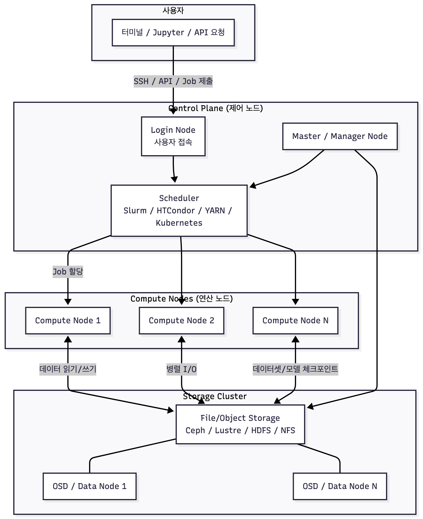 사용자는 로그인 노드를 통해 접속하고, 모든 작업은 스케줄러가 적절한 노드에 배치한다.- Compute Nodes는 스토리지와 분산 I/O를 수행