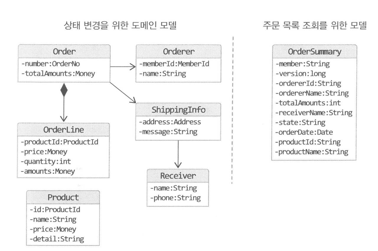 주문 내역 조회 기능을 구현하기 위해서는 주문 애그리거트와 연관된 여러 애그리거트에서 데이터를 가져와야 한다. Order, Product, Member … 즉시로딩으로 처리해야 할지, 지연로딩으로 처리해야 할지, 아니면 JPA 네이티브 쿼리를 사용해야 할지 고민이 많아진다. 그 이유는, 조회와 애그리거트 상태 변경을 구분하지 않기 때문이다. 조회의 경우 하나의 애그리거트만 수정하면 되지만, 조회는 모든 애그리거트를 JOIN 등을 통해 전부 찾아야 하기 때문에 하나의 DB 모델만으로는 조회 성능을 향상시키는 데 한계가 있다.
