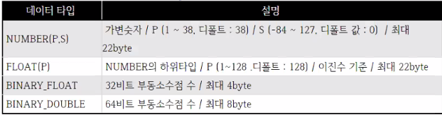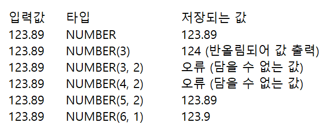 보통의 경우 NUMBER(P, S)를 쓰는데요. 이 P는 소수점을 포함한 전체 자릿수를 의미하고, S의 경우 소수점 자리들을 나타냅니다. 이 NUMBER는 가변숫자로서 이 범위를 입력해주지 않아도 자동으로 저장 데이터에 맞게 조절됩니다.