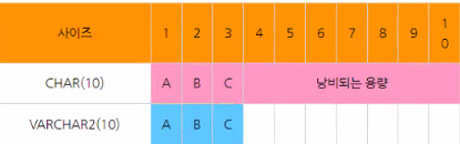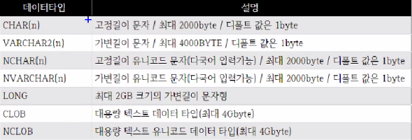이 각각의 데이터 타입마다 표시되는 (n)은 그 데이터의 길이를 지정해주는 겁니다. 그 길이를 지정함으로서, 데이터의 낭비가 없도록 방지하는 것이죠. 거기다 varchar2는 데이터에 빈 값이 있어도 남은 데이터들을 낭비하게 하지 않아 더 알맞은 데이터 타입입니다.