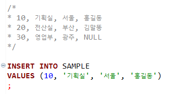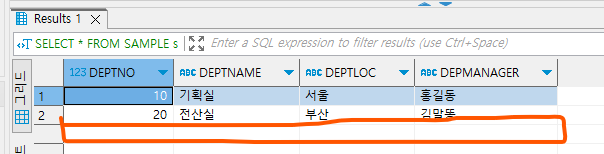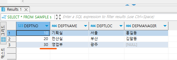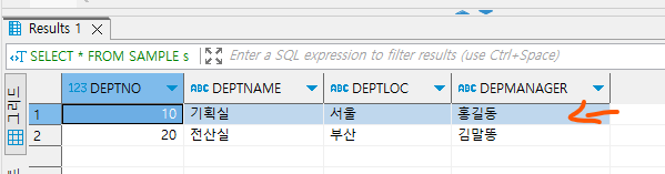 보시면 Insert into 를 통해 SAMPLE이라는 테이블에 기획실 데이터를 넣어준 게 보이시죠? 이를 출력하면 이렇게 나옵니다.