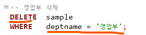 쿼리문은 위처럼 작성하시면 됩니다. Sample 이라는 테이블에서 영업부인 데이터가 들어간 열을 삭제해주도록 합시다.