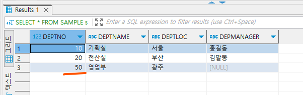 조금 전에 Sample 테이블에서 영업부라는 부서가 50으로 값이 변환되었었죠. 하지만 이번에는 이 데이터를 한번 삭제해봅시다.