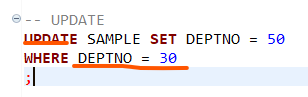 그 부분에서 그 부서 번호가 30인 사람을 50으로 바꿔주려고 합니다. 그리 하여 set에서 50을 지정하고 WHERE 조건문을 통해 30인 사원을 지목해준 것을 보실 수 있습니다.