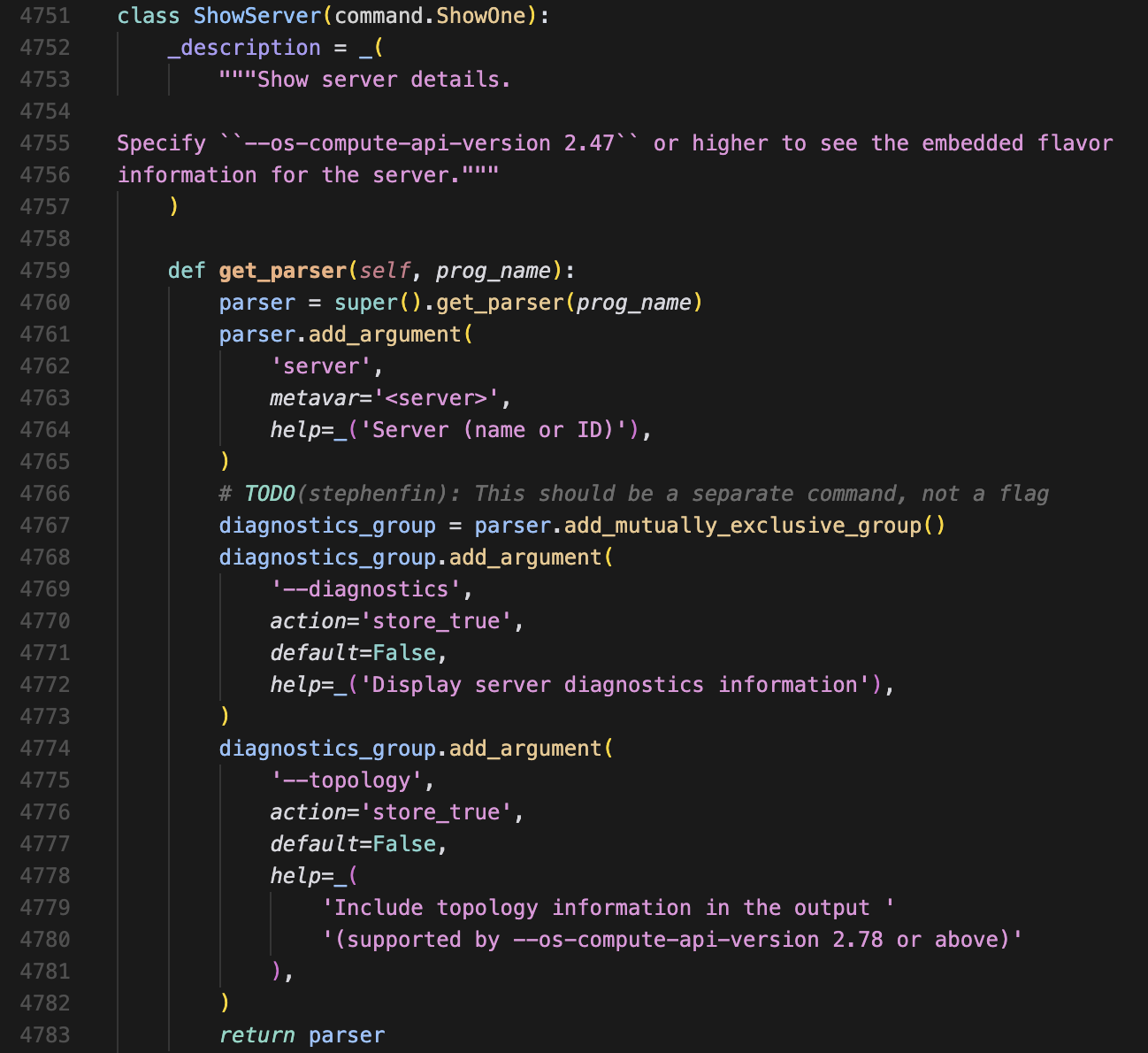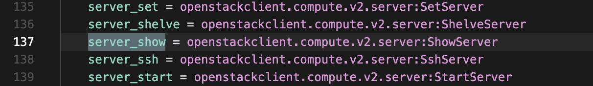 openstack server show 라는 CLI 명령을 입력하면, 어떤 python 파일과 클래스를 실행해야 할지를 setup.cfg 파일에서 먼저 찾습니다. 예를 들어, openstack server show 명령을 실행하면, openstackclient/compute/v2/server.py 안에 있는 ShowServer 클래스를 실행합니다.
