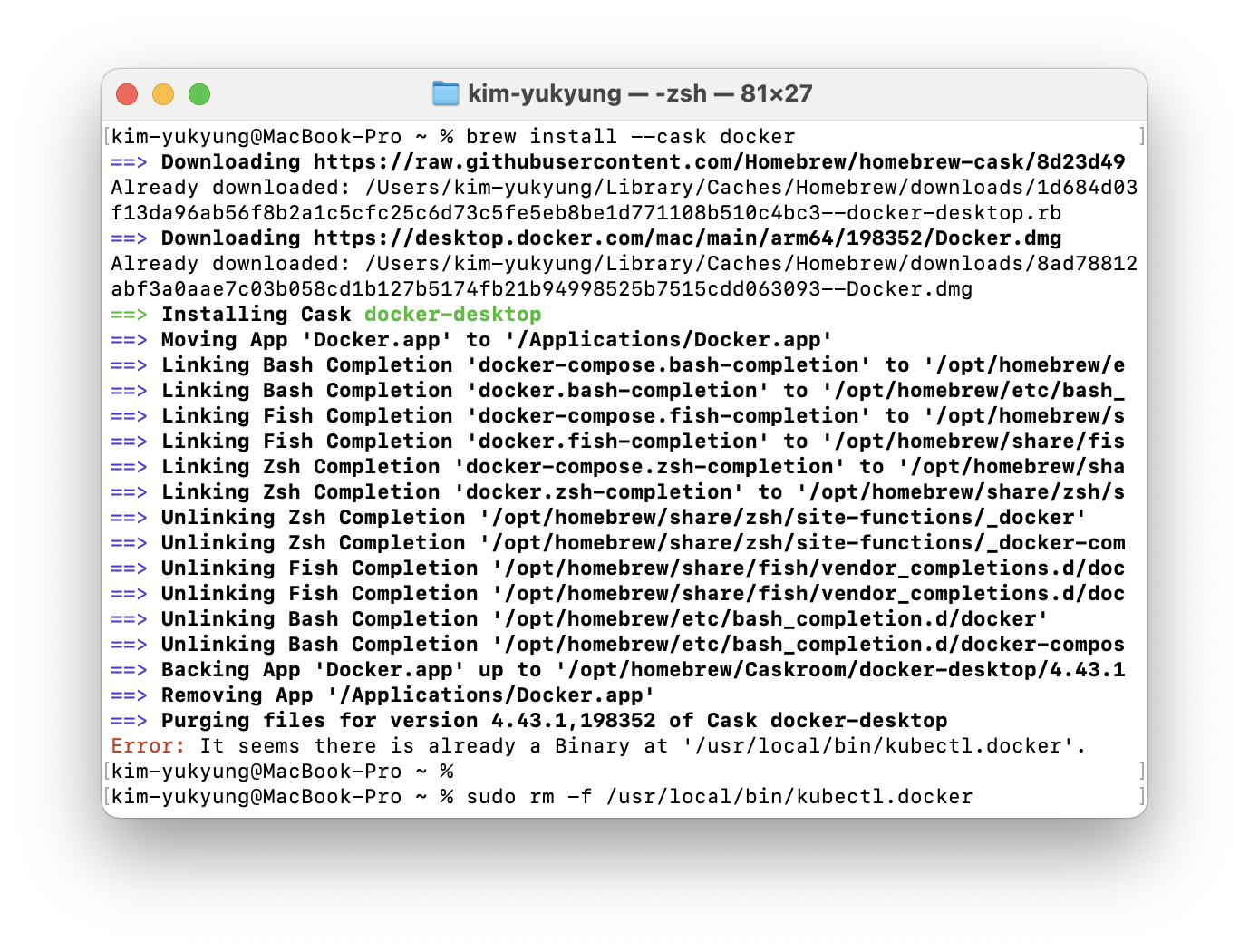 그래서 재설치를 시도했지만, 아래처럼 brew reinstall --cask docker 명령 실행 시 이미 존재하는 바이너리 파일들로 인해 충돌 오류가 반복적으로 발생했습니다.