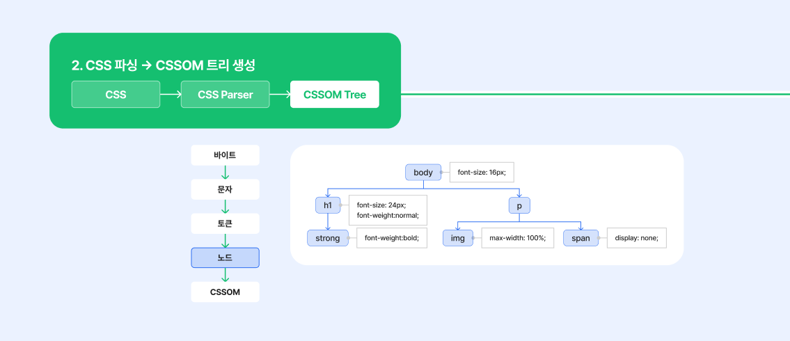 브라우저로부터 전달받은 CSS 파일을 문자로 해석하게 되고, 가지고 있는 토큰과 비교를 해서 노드를 발행한다. 이러한 노드들이 모여서 CSSOM 트리(CSS OBJECT MODEL)가 만들어진다.