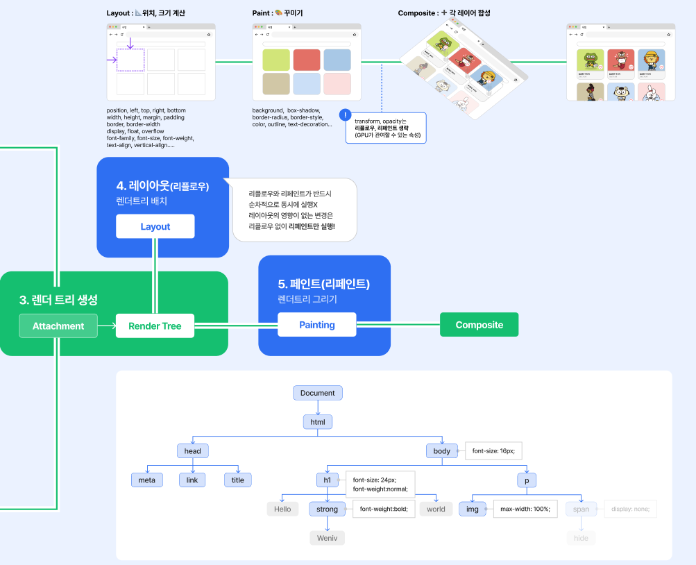 1) DOM 트리와 CSSOM 트리가 합쳐져서 렌더트리가 생성되는데, 이를 크게 레이아웃 단계라고 표현한다.