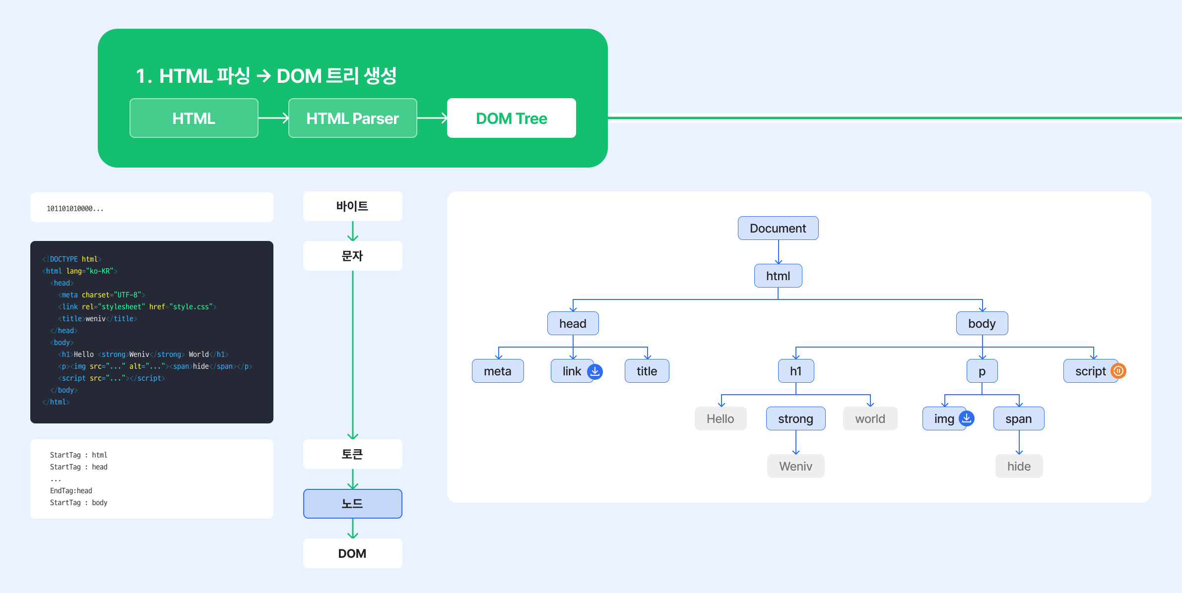 2) 브라우저는 전송받은 바이트 데이터를 문자로 변환을 하고, 가지고 있는 토큰과 비교를 해서 해당 문자가 HTML 코드인지 확인한다.
