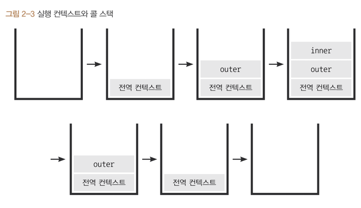 6. (2)의 다음 줄부터 이어서 실행하고 a 변수의 값을 출력하고 나면 outer 실행 컨텍스트가 콜 스택에서 제거되어 전역 컨텍스트만 남아 있게 된다.