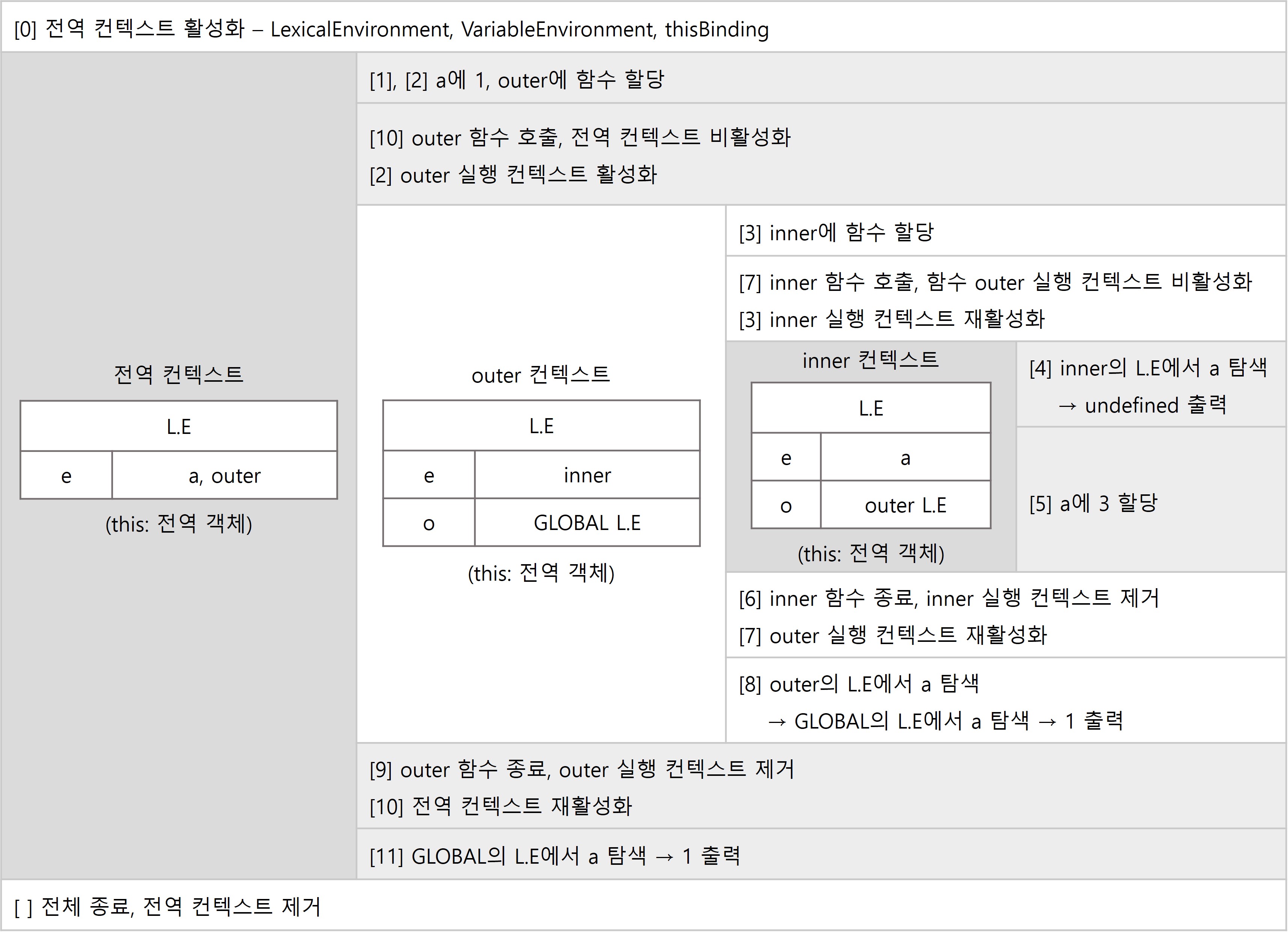 3. 전역 컨텍스트와 관련된 코드의 실행을 일시중단하고 outer 실행 컨텍스트와 관련된 코드인 outer 함수 내부의 코드들을 순차로 실행한다.