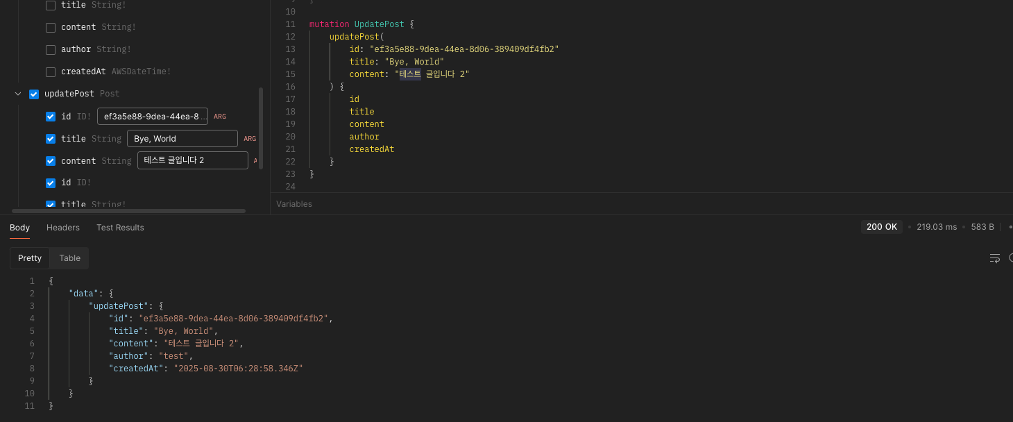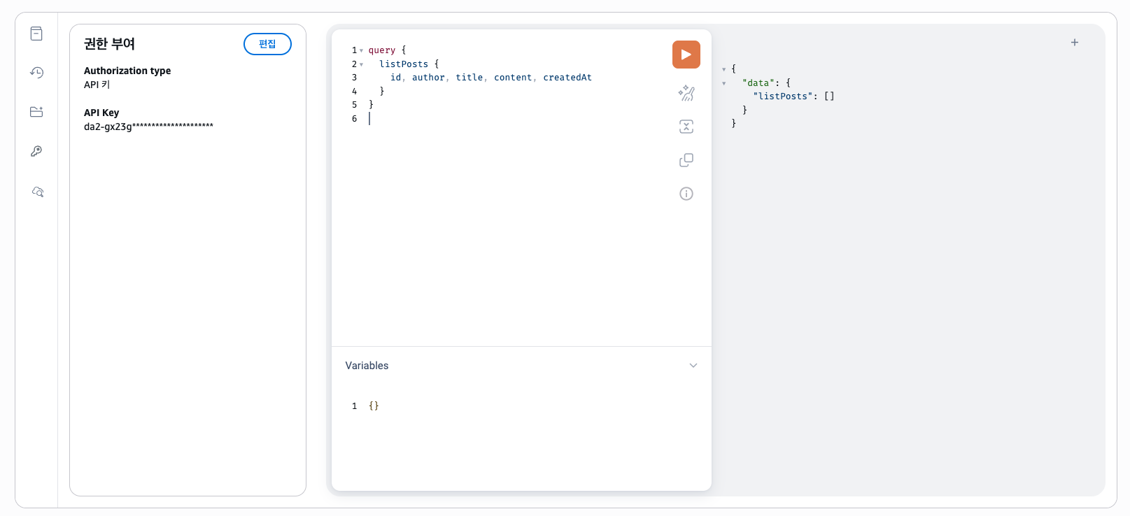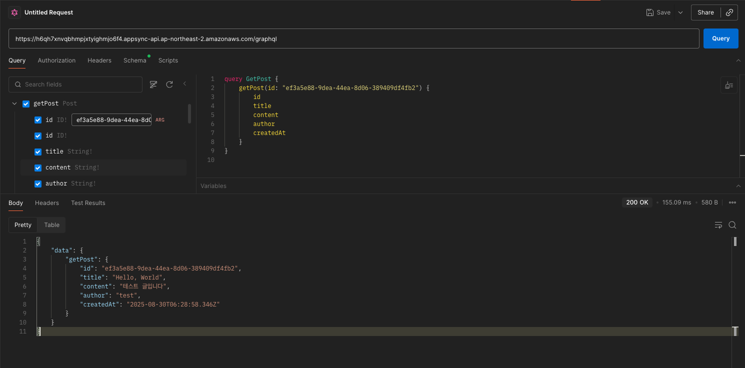 listPosts와 getPost는 API 키를 사용하도록 하였기 때문이다. 헤더에 x-api-key를 추가해주자. (API 키는 AppSync 설정에서 확인할 수 있다.)