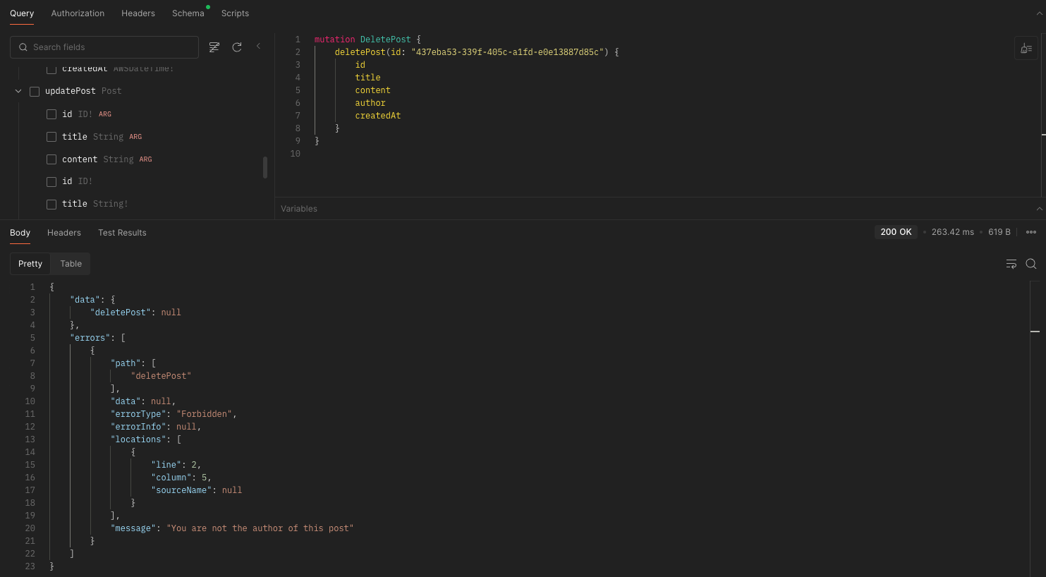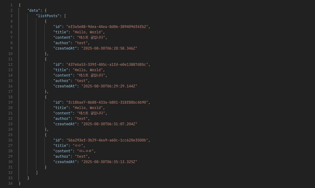 실행 후 listPosts 쿼리를 보내보면 에러가 날 것이다.