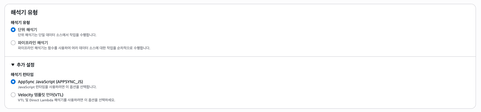 Resolver 유형은 단위 Resolver로 선택한다. 파이프라인은 AppSync 함수를 여러개 붙여서 순차적으로 Resolve하는 기능이다.