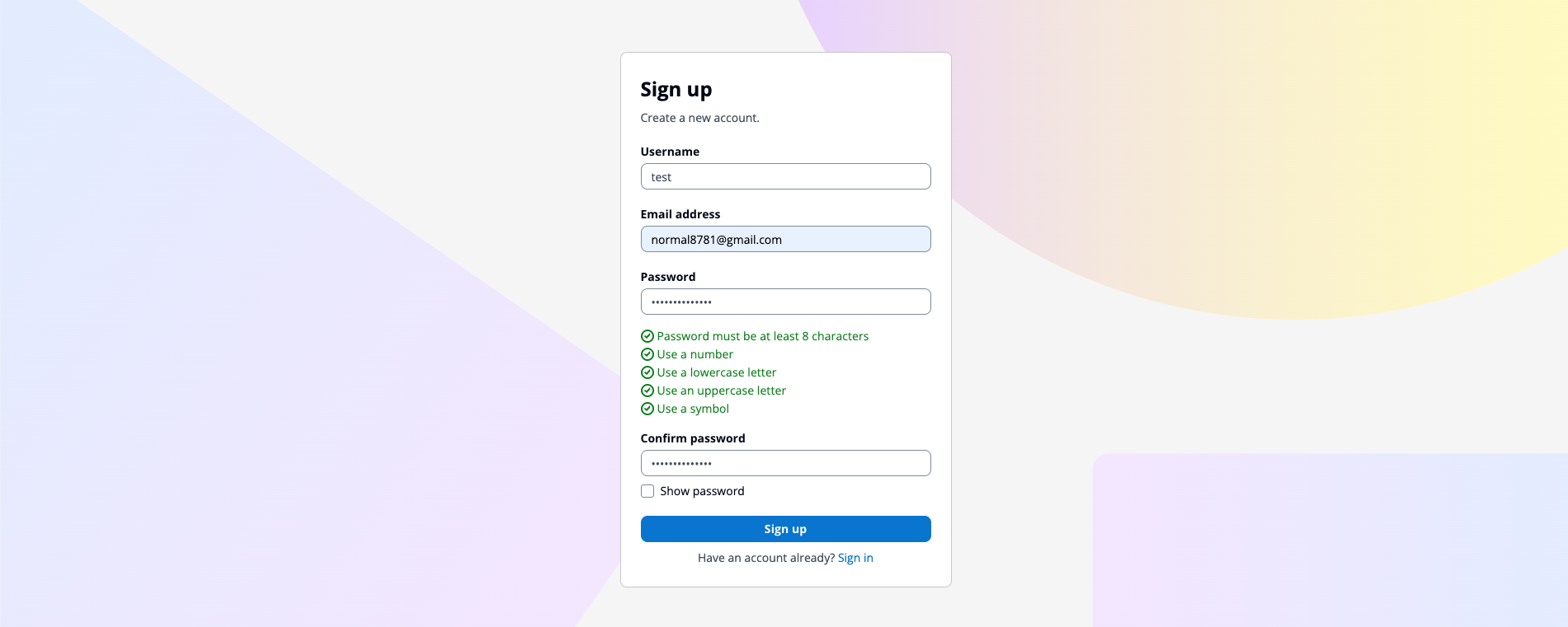 이렇게 Cognito 유저 풀과 애플리케이션을 생성해주었다. 로그인 페이지로 들어가서 회원가입을 해보자.