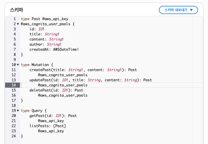 그리고 스키마 저장을 해주자. @aws_api_key나 @aws_cognito_user_pools 지시자는 인증에서 어느 방식을 사용할건지 명시해주는 지시자이다. CUD(뮤테이션)는 Cognito 인증 방식을 사용한다.