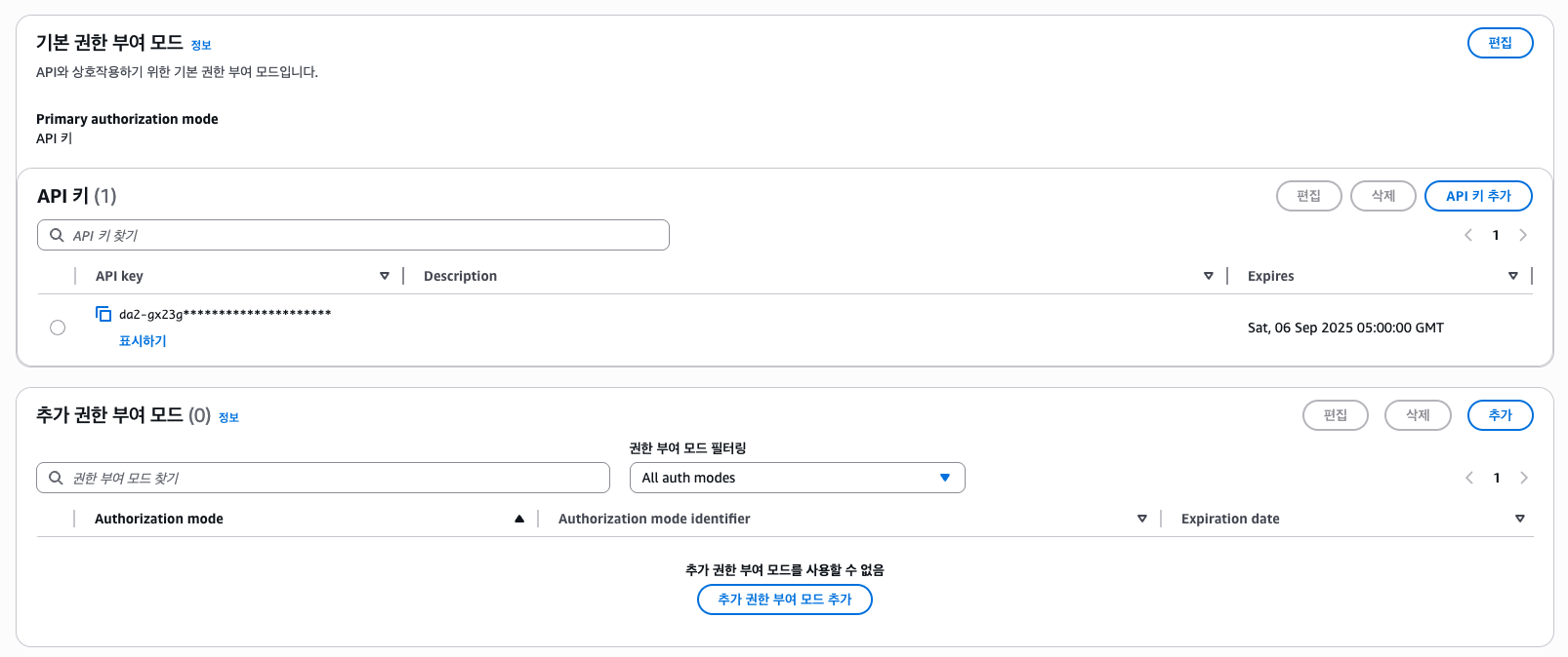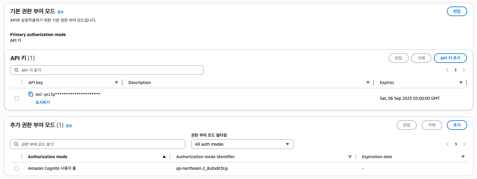 기본 권한 부여 모드는 API 키로 되어있는데, 밑에 추가 권한 부여 모드에 Cognito 방식을 추가해줘야 한다.
