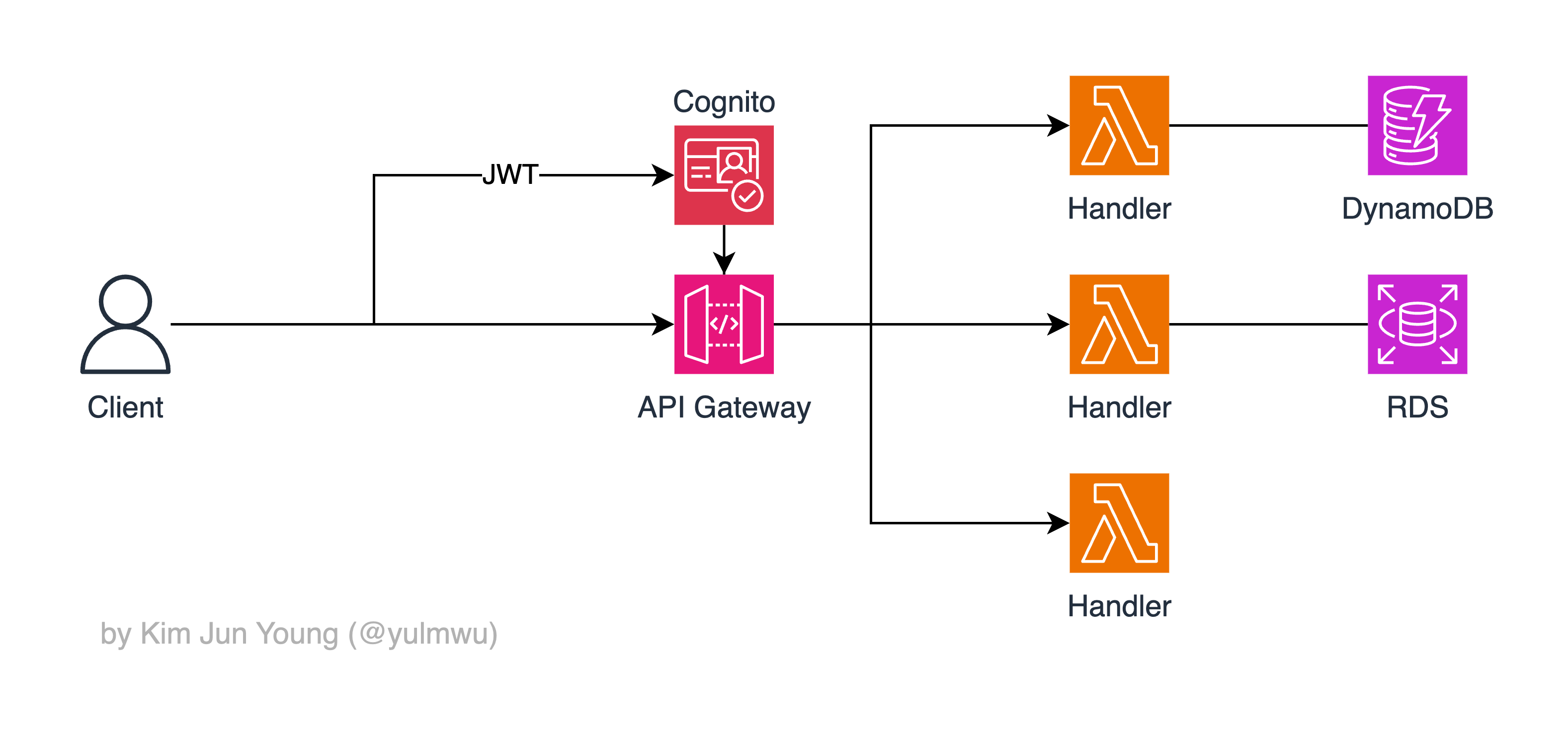 위 아키텍처는 API Gateway를 사용한 간단한 예제이다. Cognito와 연결하여 인증을 하고, API Gateway의 각 엔드포인트에 연결된 람다 함수가 있으며 그 람다 함수에서 DB에 접근하는 것이다.
