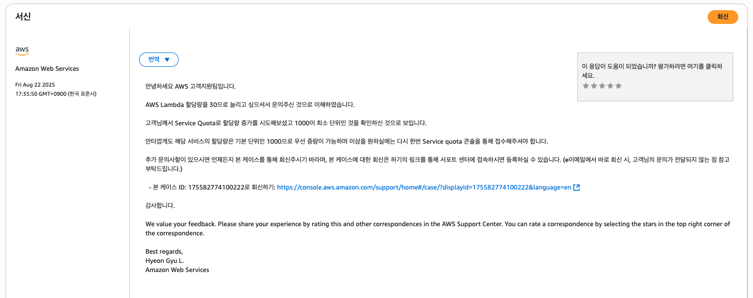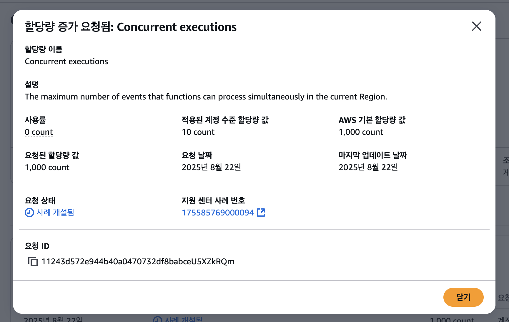 요청 후 12시간 정도 지나니 동시성 제한 할당량이 1000개로 늘어났다.