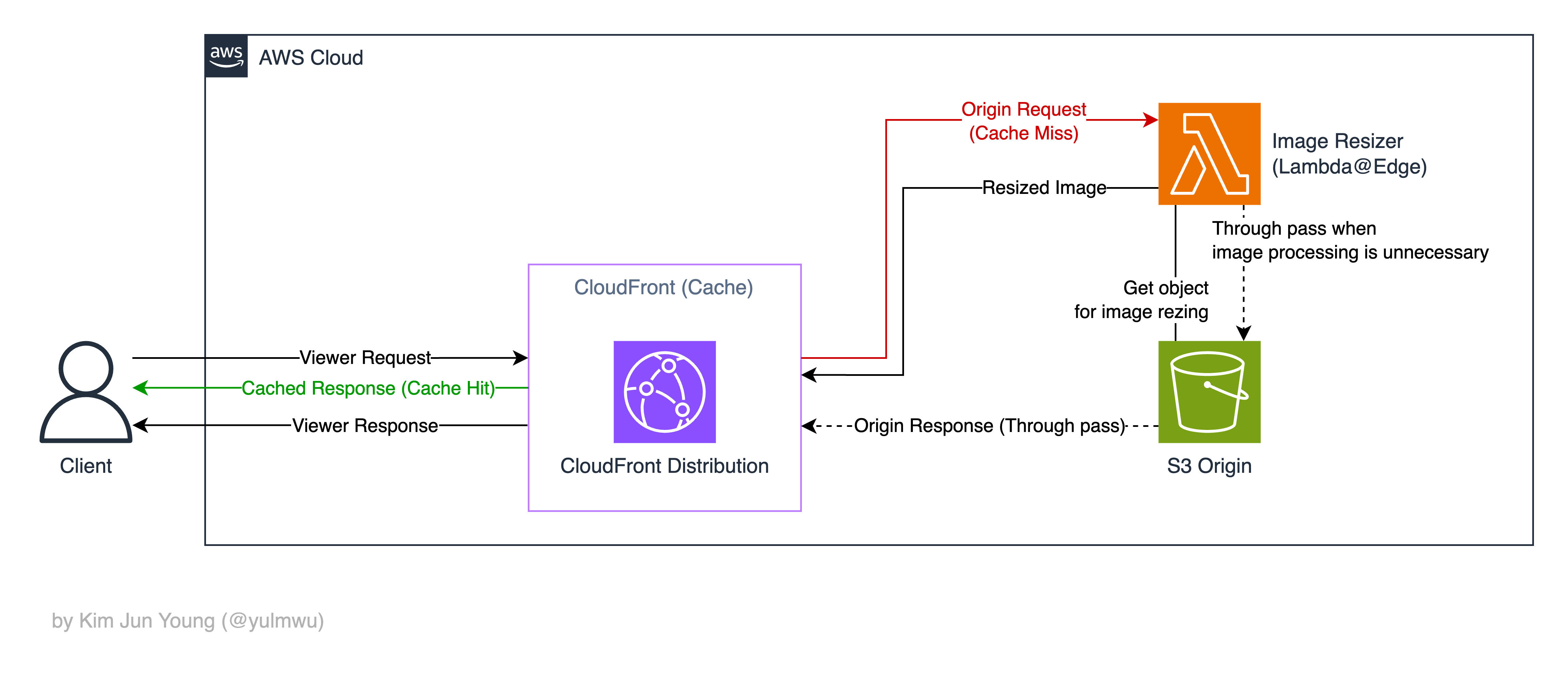 Origin Request를 Lambda@Edge로 보낸 다음, 이미지를 S3 버킷에서 가져온 뒤 리사이징 후 반환한다.