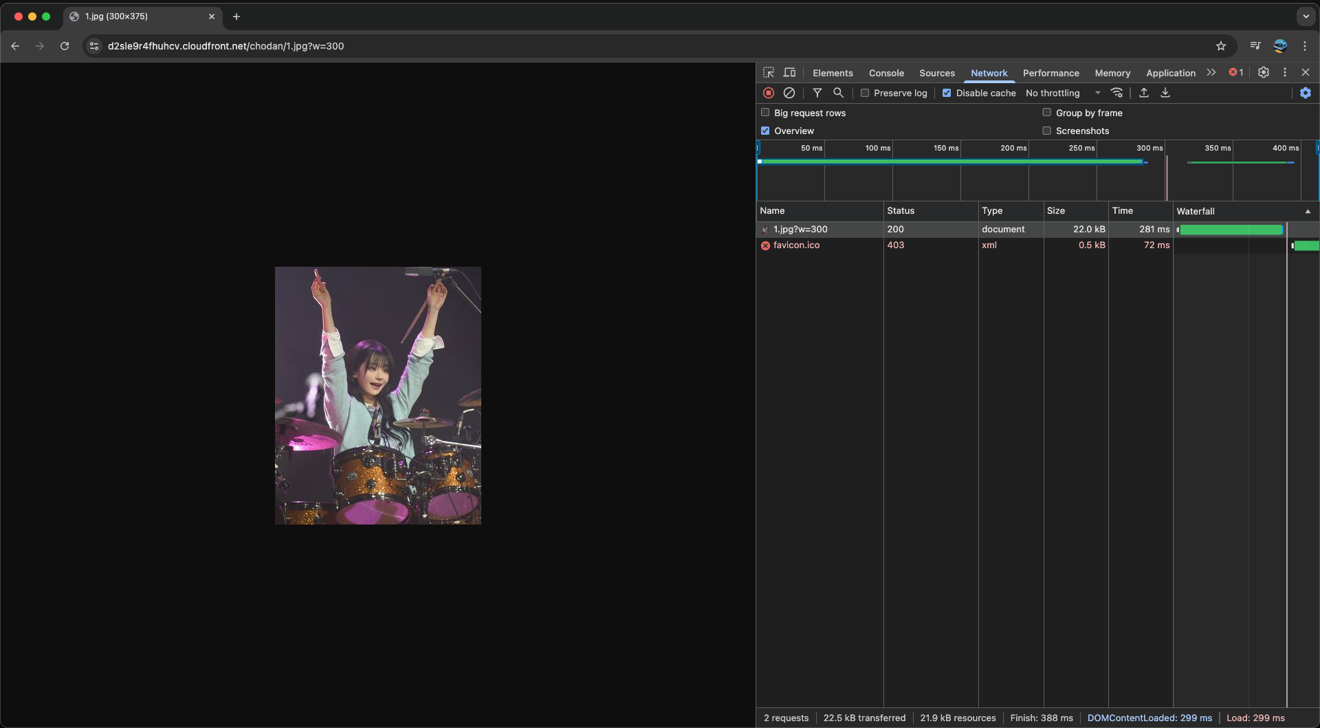 이제 CloudFront URL 뒤에 ?w=300 등의 쿼리를 붙여 잘 동작하는지 확인해보자. (Lambda@Edge가 적용되는데 시간이 걸릴 수 있다.)
