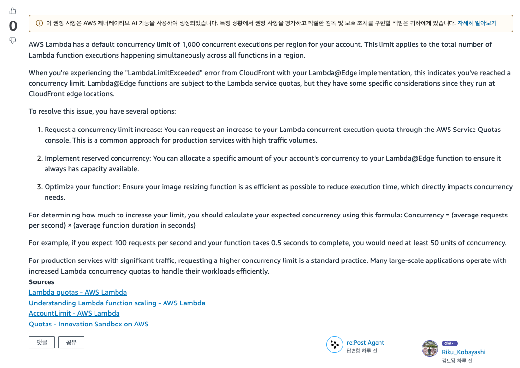 일단 애초에 이게 Lambda@Edge에도 적용이 되는지 확실하게 알기 위해 re:Post에 질문을 남겼다.