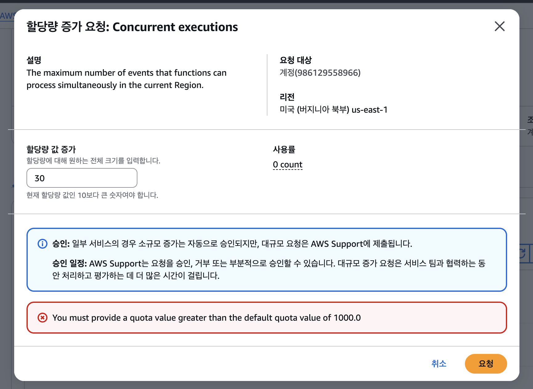 그래서 람다 동시성 제한을 1000개로 늘려주었다.