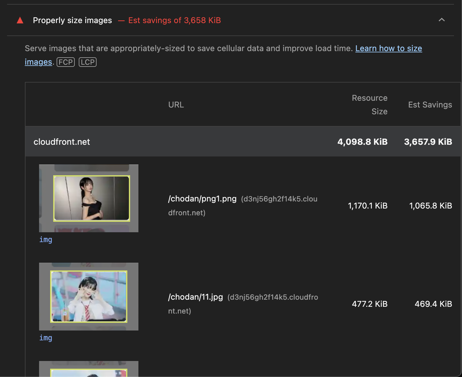 이 문제를 해결할 방법은 간단하다. 서버에서 제공해주는 이미지의 크기를 적절하게 줄이면 된다. 그러면 용량도 줄어들테고, 랜더링 시간도 줄어들어 LCP 또한 낮아져 최적화를 할 수 있다.