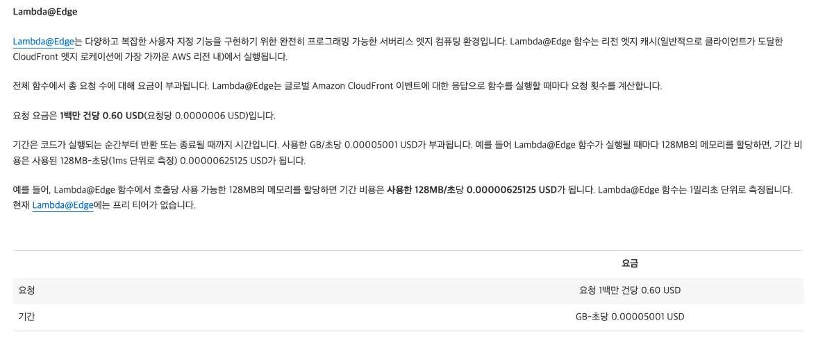Lambda@Edge 경우 기존의 람다와는 살짝 다르며, 요금이 살짝 더 비싸다. Lambda@Edge도 마찬가지로 2가지의 요소로 요금이 부과된다.