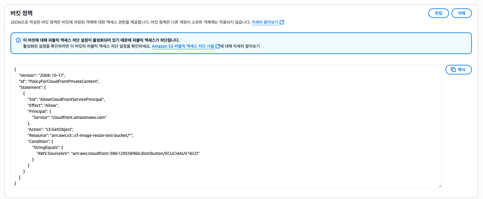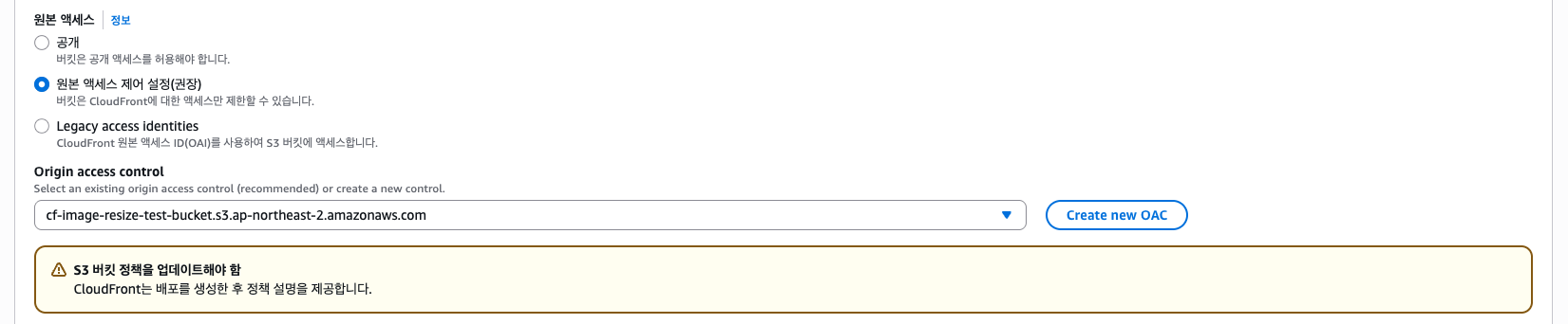 두번째의 경우는 CloudFront와 같이 캐싱이 되는 경우 유리한데, 이미지를 동적으로 리사이징 후 캐싱하기 때문에 한번 처리하고 나면 빠르게 캐싱 + 리사이징된 이미지를 가져올 수 있다. (S3 버킷 저장 없음)